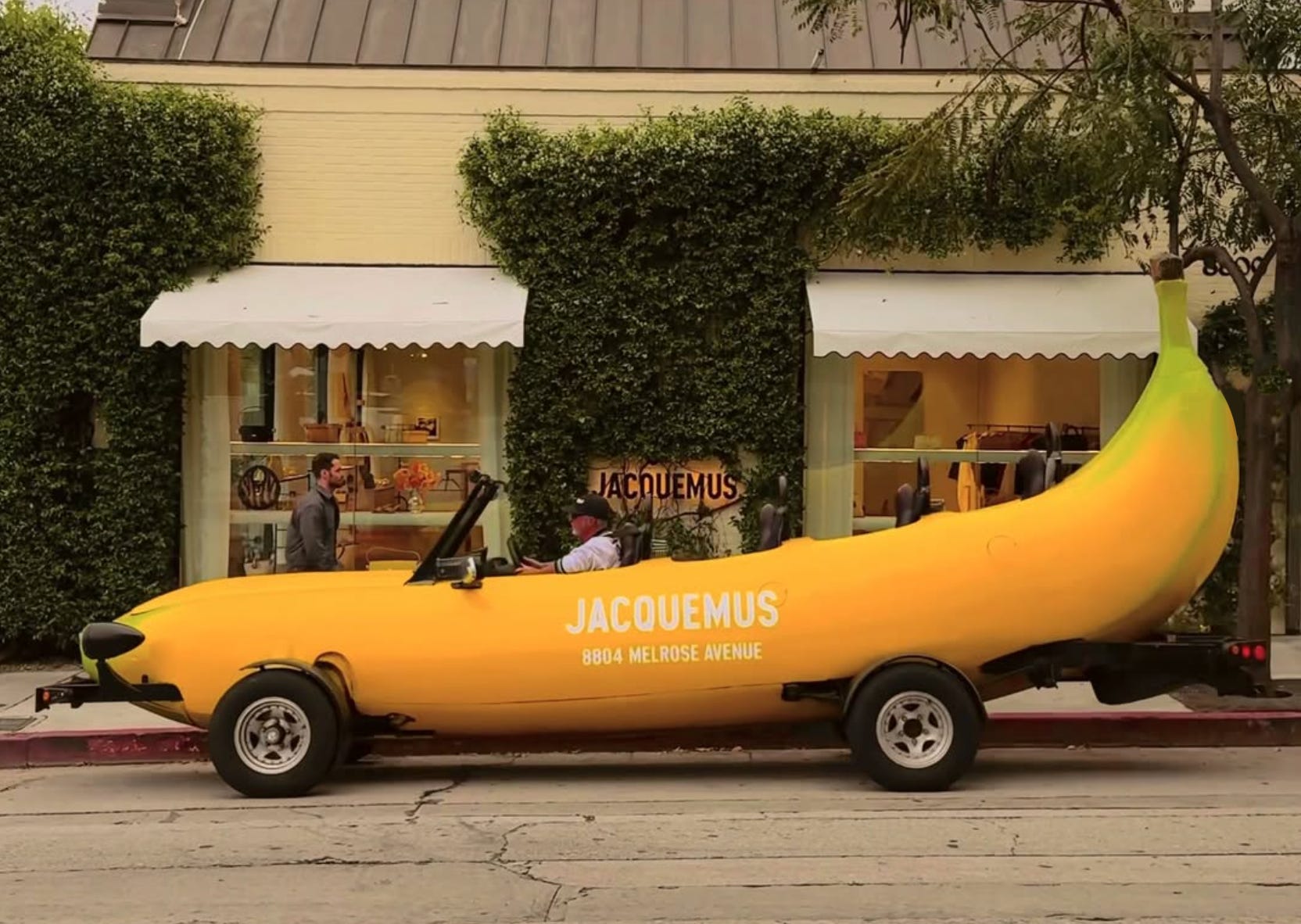 In case you literally take up residence underneath a rock: the Jacquemus boutique launch on Melrose was a banana-studded spectacle for the ages. Marking a seismic shift in how luxury retail moves through culture, the brand’s touchdown was engineered to travel fast online and linger offline for years to come — no doubt it will be studied in history books in years to come. Featuring a giant banana on wheels and a Provençal flower stand, the store was designed to feel more like a curated mood than a commercial space.