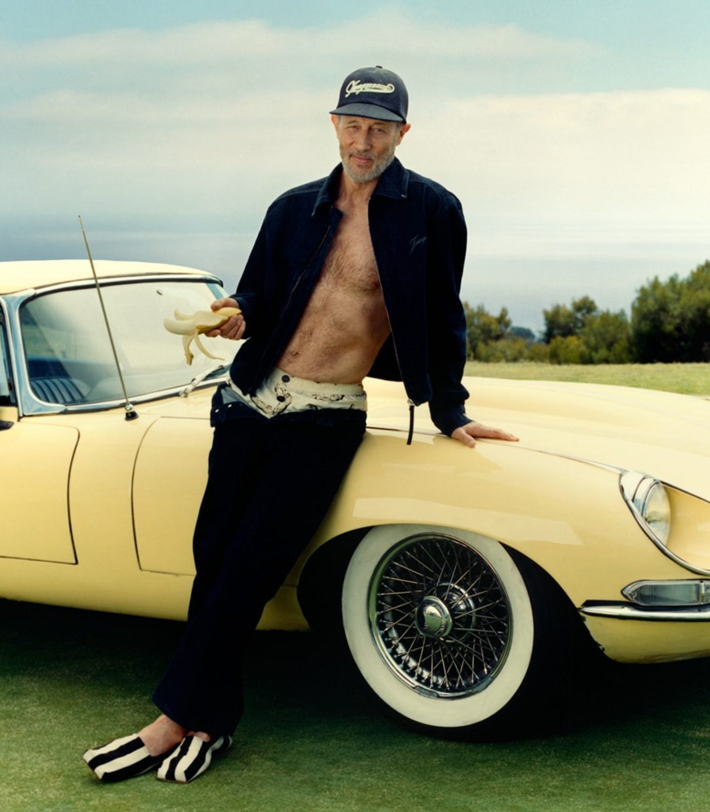 The inclusion of Jon Gries (or ‘Greg/Gary’ as all of us who have donated weeks of our lives to binging White Lotus will know him) landed with chef’s kiss precision. The villain, captured in various states of dress alongside bananas, wasn’t merely a cameo but a continuation of Jacquemus’ ongoing exploration of generational tension, irony and nostalgia. The reference felt natural, not opportunistic — perfectly timed with the cultural momentum around The White Lotus finale and reflective of the brand’s deeper relationship with narrative construction.